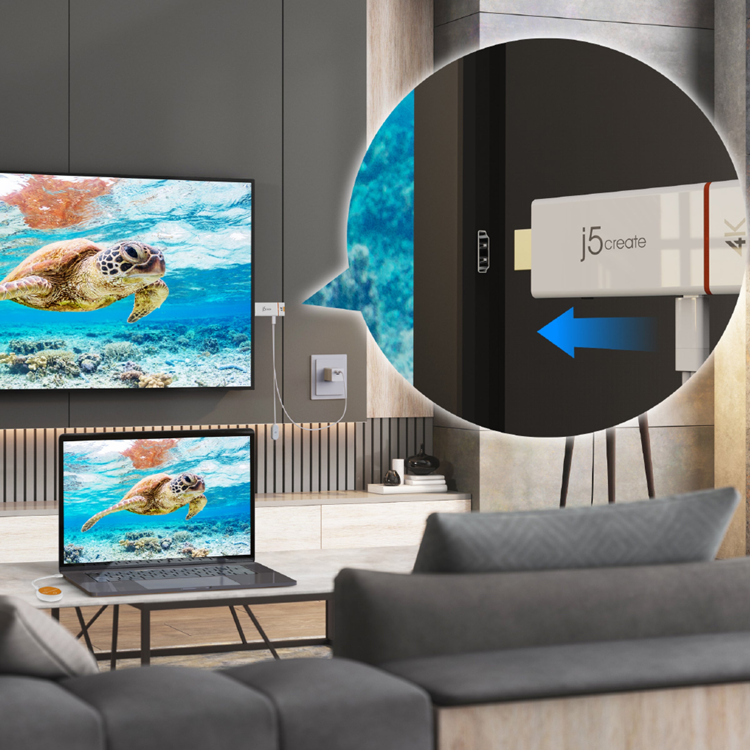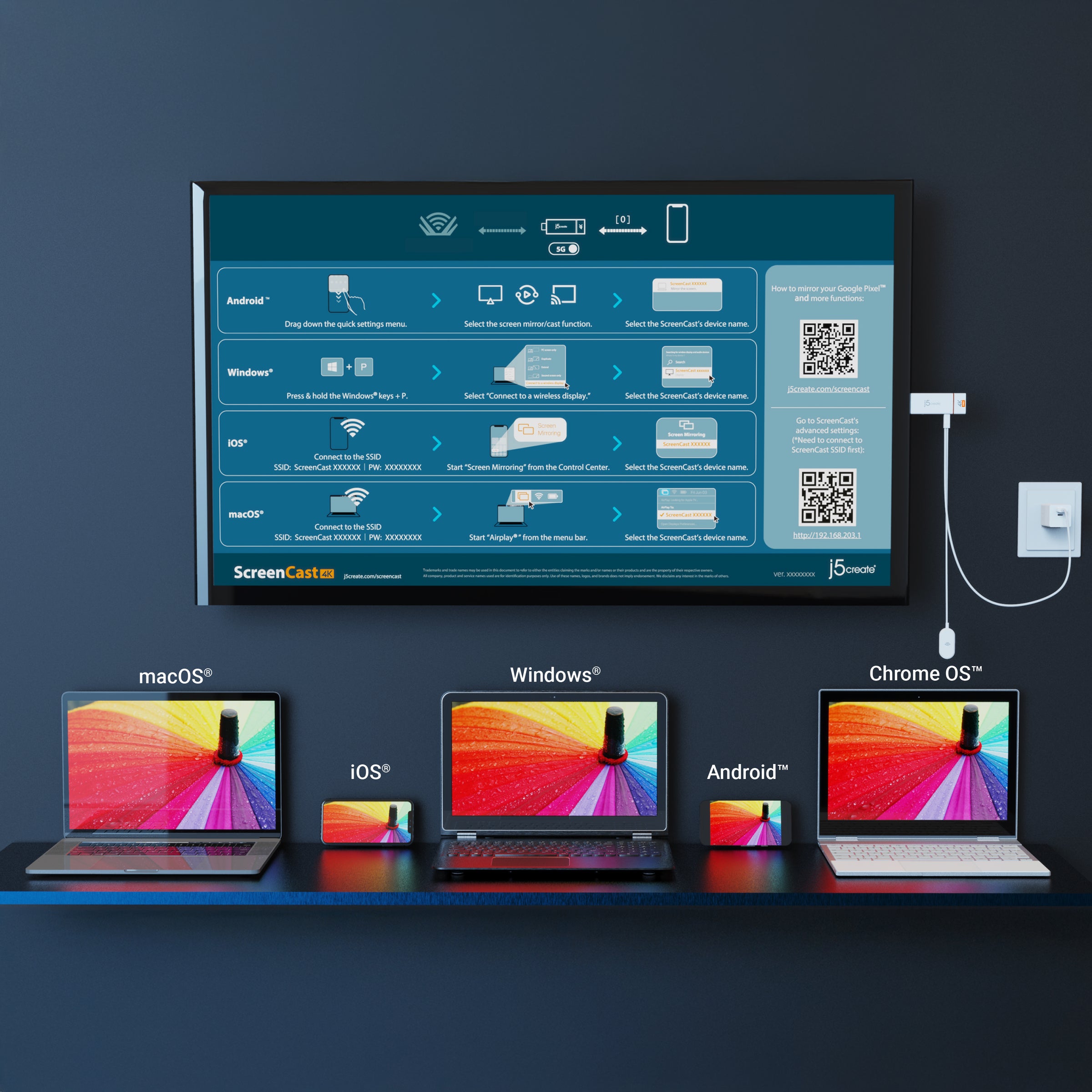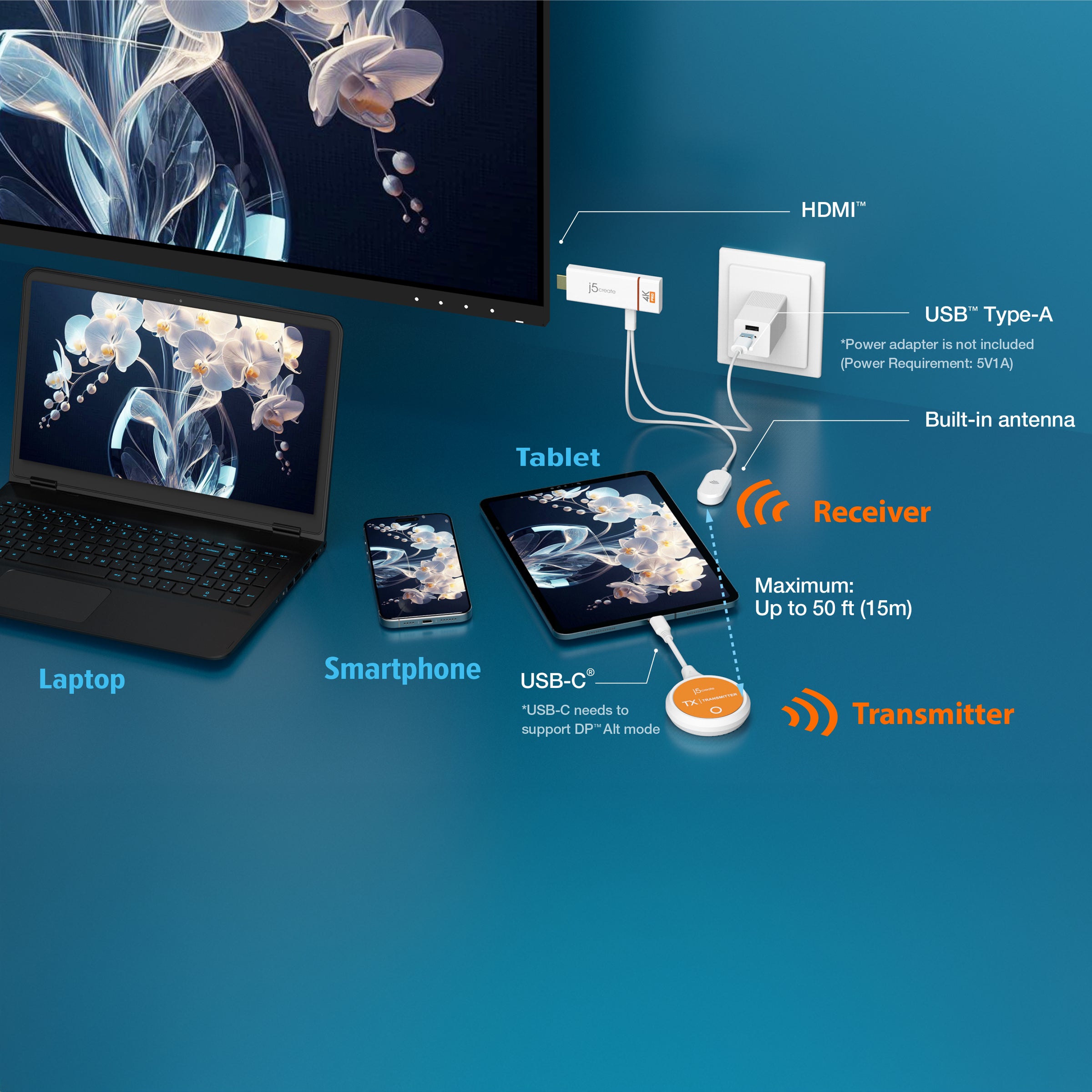 Just plug in the adapter, power, and connect to the ScreenCast 4K (Wireless transmission distance of up to 50 ft./15m in an open environment) to start casting.