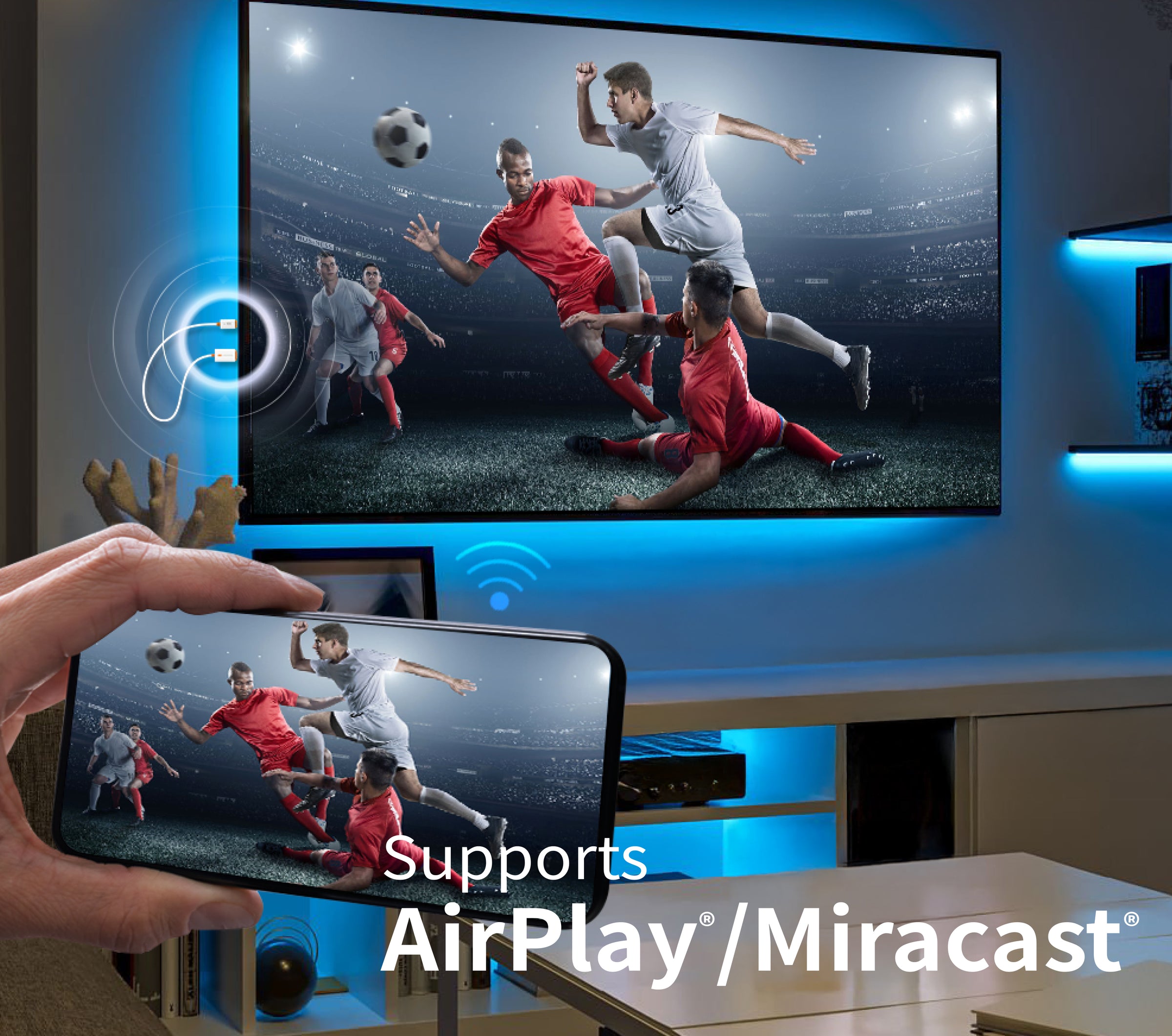 - Full HD wireless casting with low latency, supporting AirPlay® and Miracast®.
