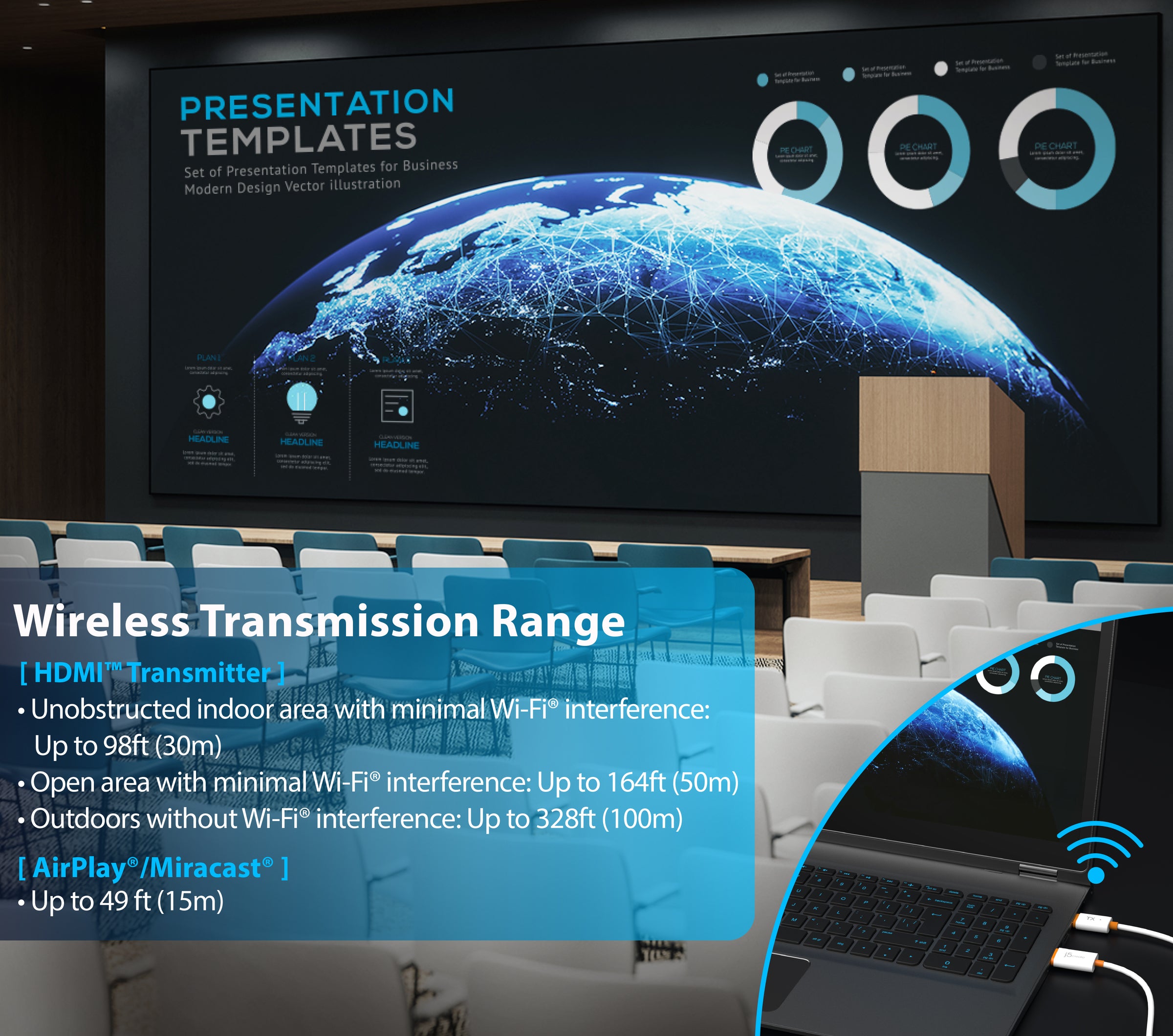 Wireless transmission enables seamless device connectivity, freeing you from a single location and simplifying tasks such as live streaming, presenting, or working across large areas.